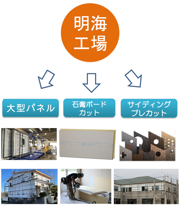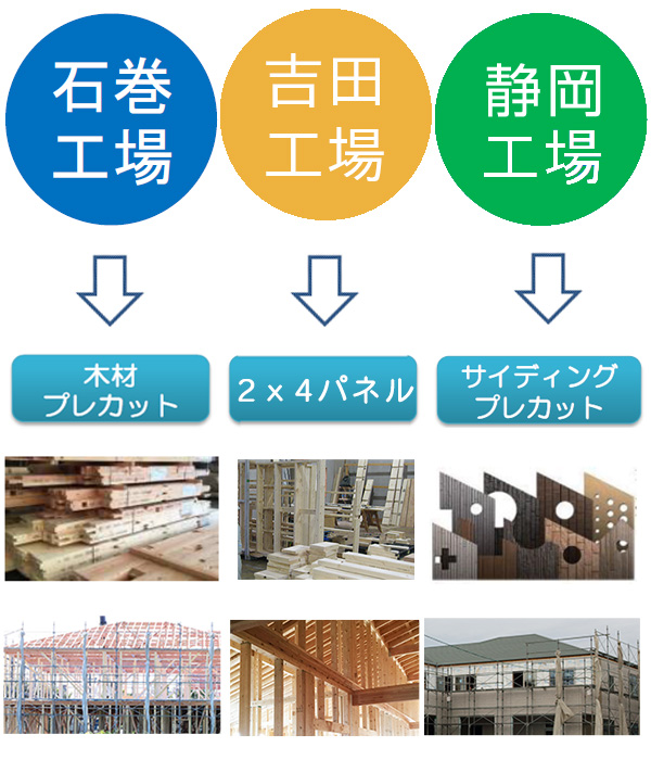 3つ目は、木造住宅構造材の製造・加工販売。当社の自社工場では、木材や合板、サイディング(住宅用外壁材)のプレカット加工、石膏ボードの加工、2×4パネルの製造などを手掛けています。建築現場での作業量や廃材を軽減できるものを中心に供給しています。